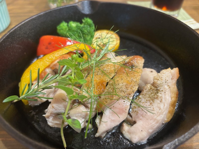 畑のお隣、カフェこもれびさんの人気メニュー『ハーブチキンソテー』6月頃からは採りたてのハーブで提供されます(曜日限定)